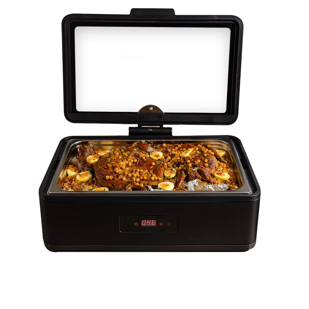 جهاز تسخين بوفيه كهربائي بتصميم عصري أنيق يحافظ على الطعام دافئًا لفترات طويلة. يتميز بشاشة تحكم رقمية بدرجة الحرارة لضبط الحرارة بدقة. يتيح الغطاء الزجاجي الشفاف متابعة الطعام دون الحاجة إلى فتحه. مثالي للمنازل والمطاعم والفنادق والبوفيهات. متوفر بحجمين ليناسب احتياجاتك: